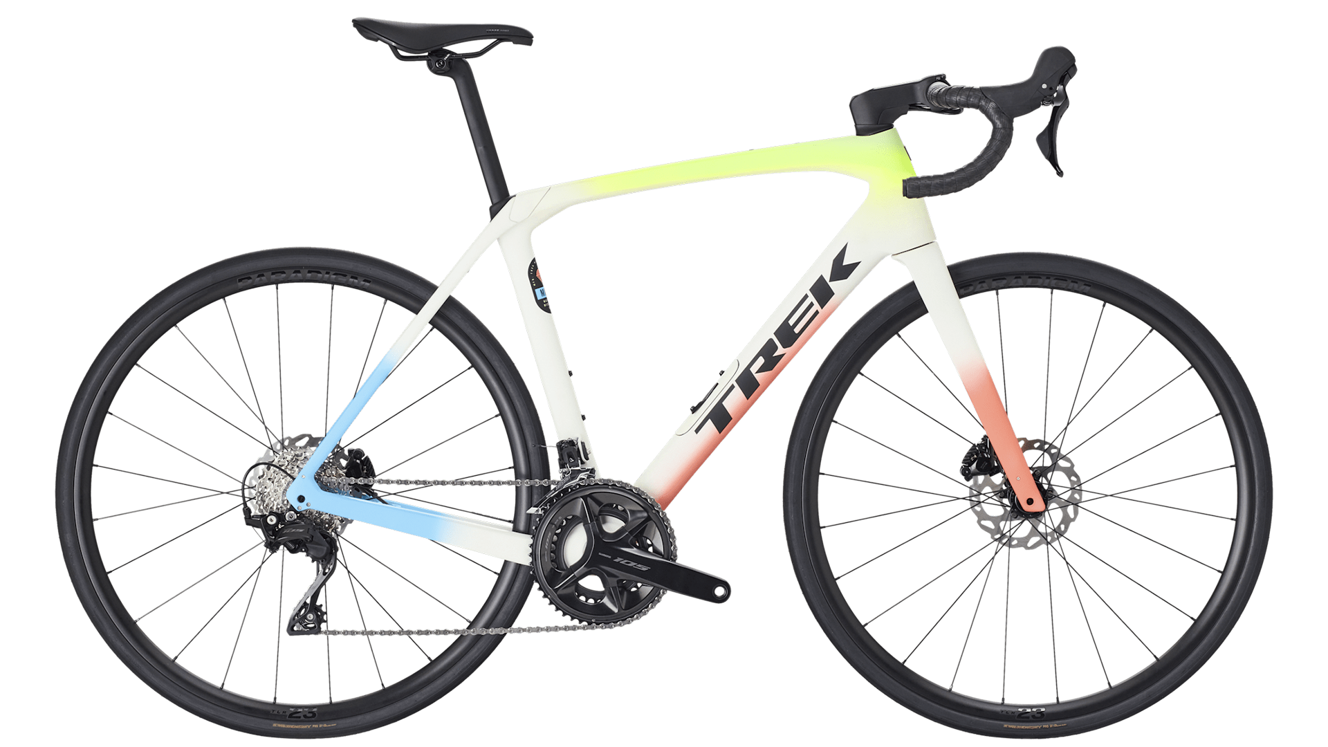 Domane SL em carbono, coluna de direção cónica em carbono, cabos internos dos travões, pontos de fixação para guarda-lamas, travões de disco flat mount, eixo passante de 12x100 mm. Movimento pedaleiro Praxis, roscado T47, rolamento interno. Cassete Shimano 105 7101, 11-34, 12 velocidades. Corrente Shimano SLX M7100, 12 velocidades.