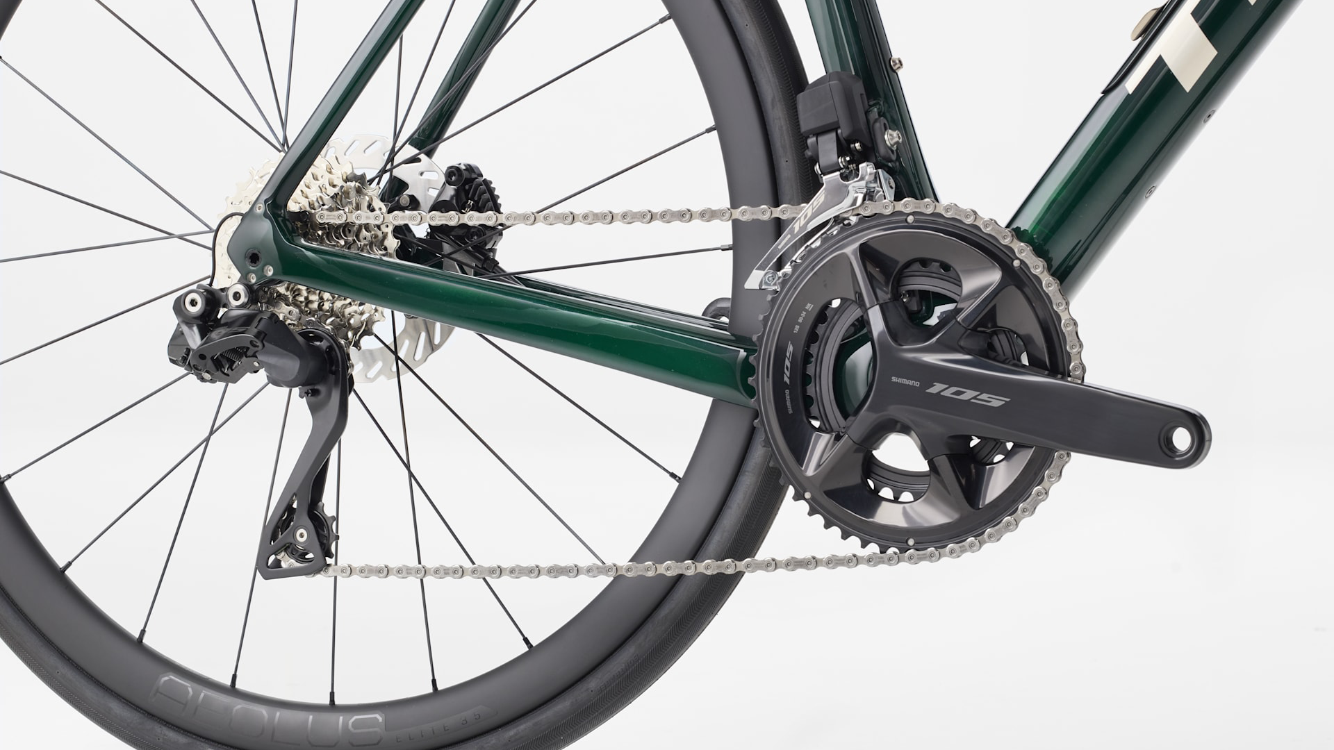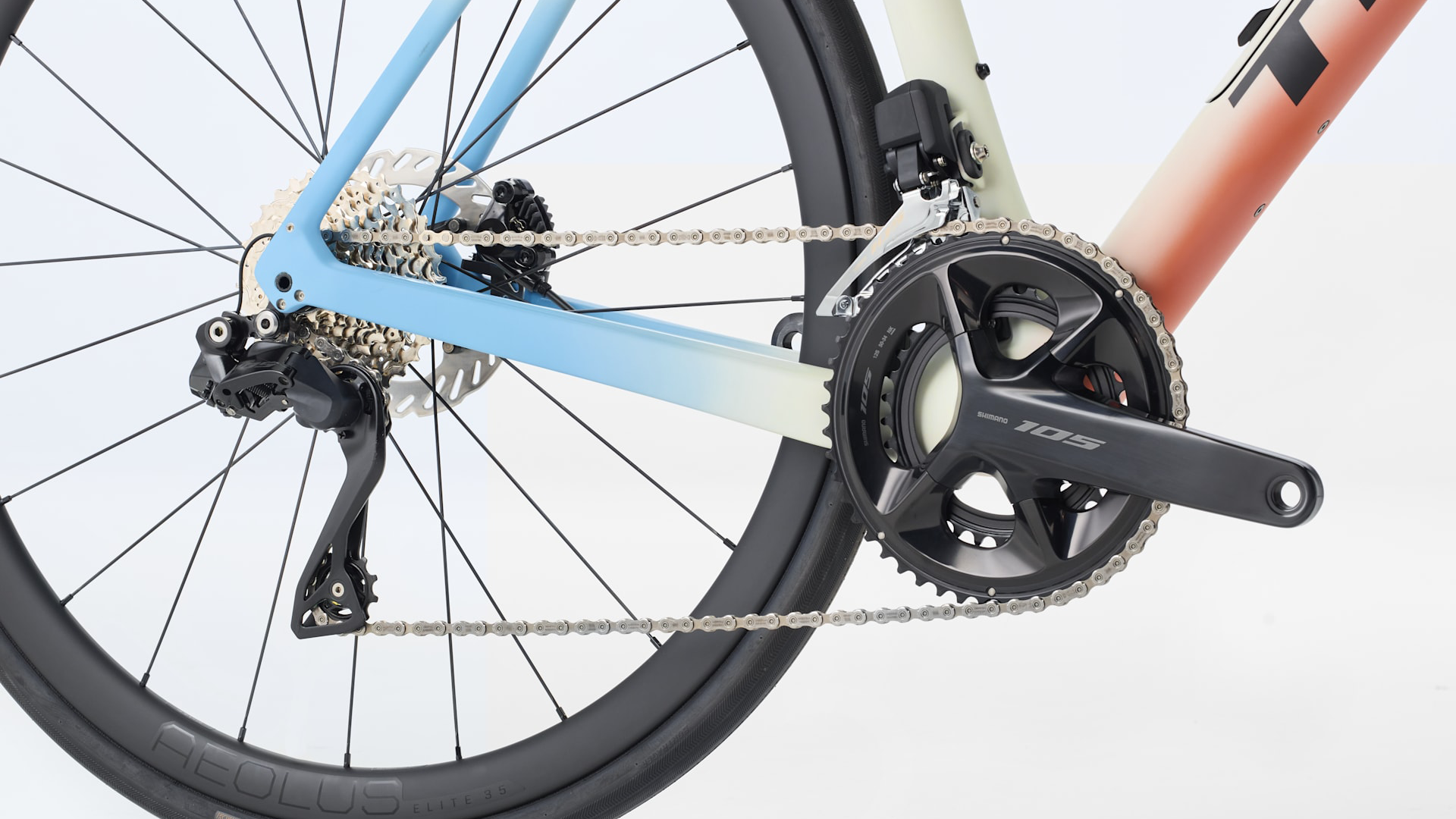 Shimano 105 Di2 – Partilhando a plataforma herdada do Dura-Ace e com a ergonomia sofisticada do Ultegra, a desmultiplicação de mudanças otimizada do Shimano 105 e com um sistema de travões de disco hidráulicos excecional, o grupo Shimano 105 Di2 R7100 marca uma nova era em termos de transmissões eletrónicas de 12 velocidades com preço aceitável. Podes afinar a transmissão da forma que quiseres através da intuitiva aplicação E-Tube da Shimano.