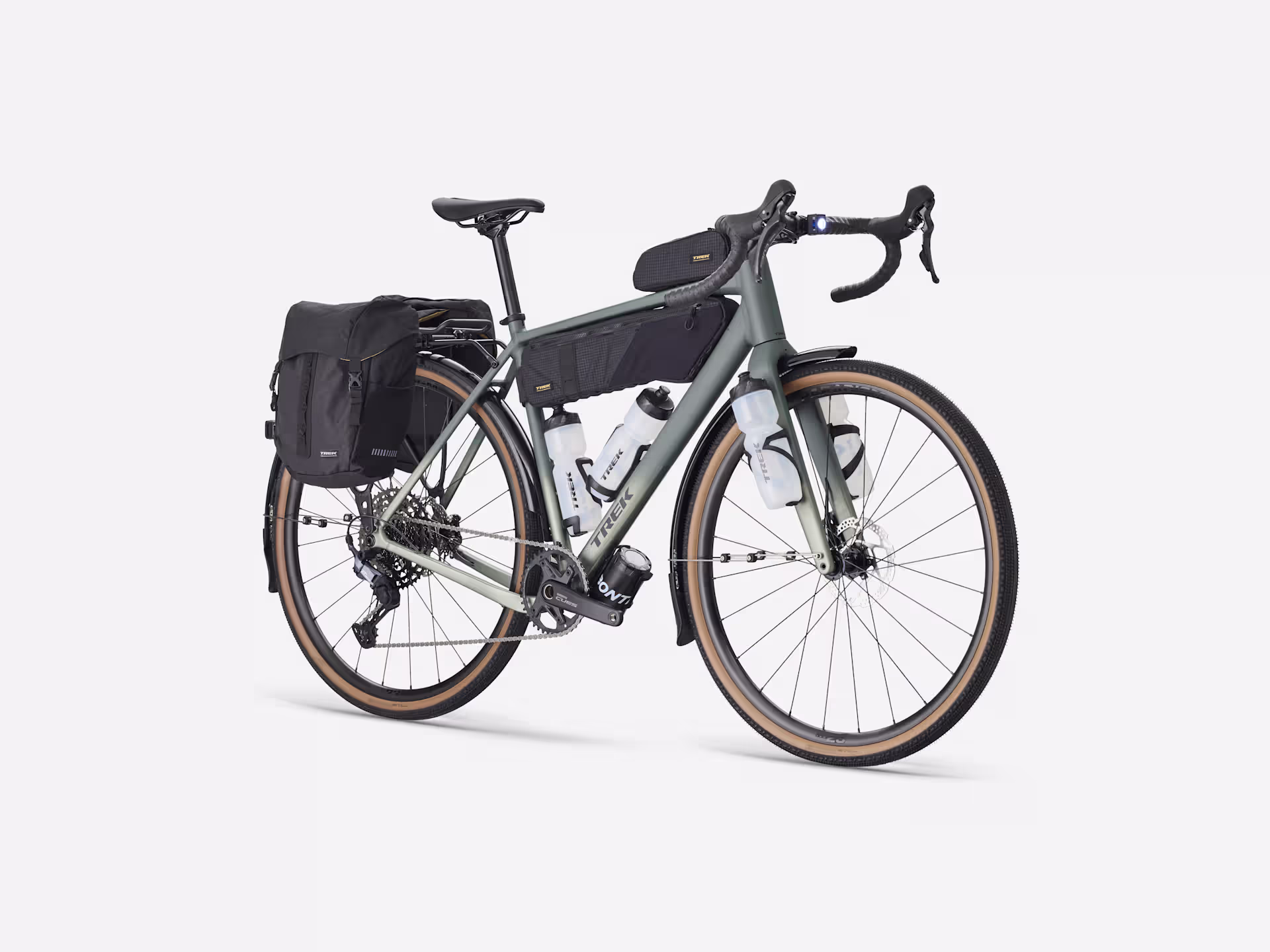 Quadro em Alumínio Alpha 300 Series com forqueta em carbono e espaço para pneus até 50 mm, transmissão Shimano CUES U8000 de 11 velocidades, travões de disco hidráulicos Shimano, rodas Bontrager Paradigm com pneus Bontrager Girona Pro Tubeless Ready, bem como imensos pontos de fixação para bolsas, porta-bagagens e equipamento.