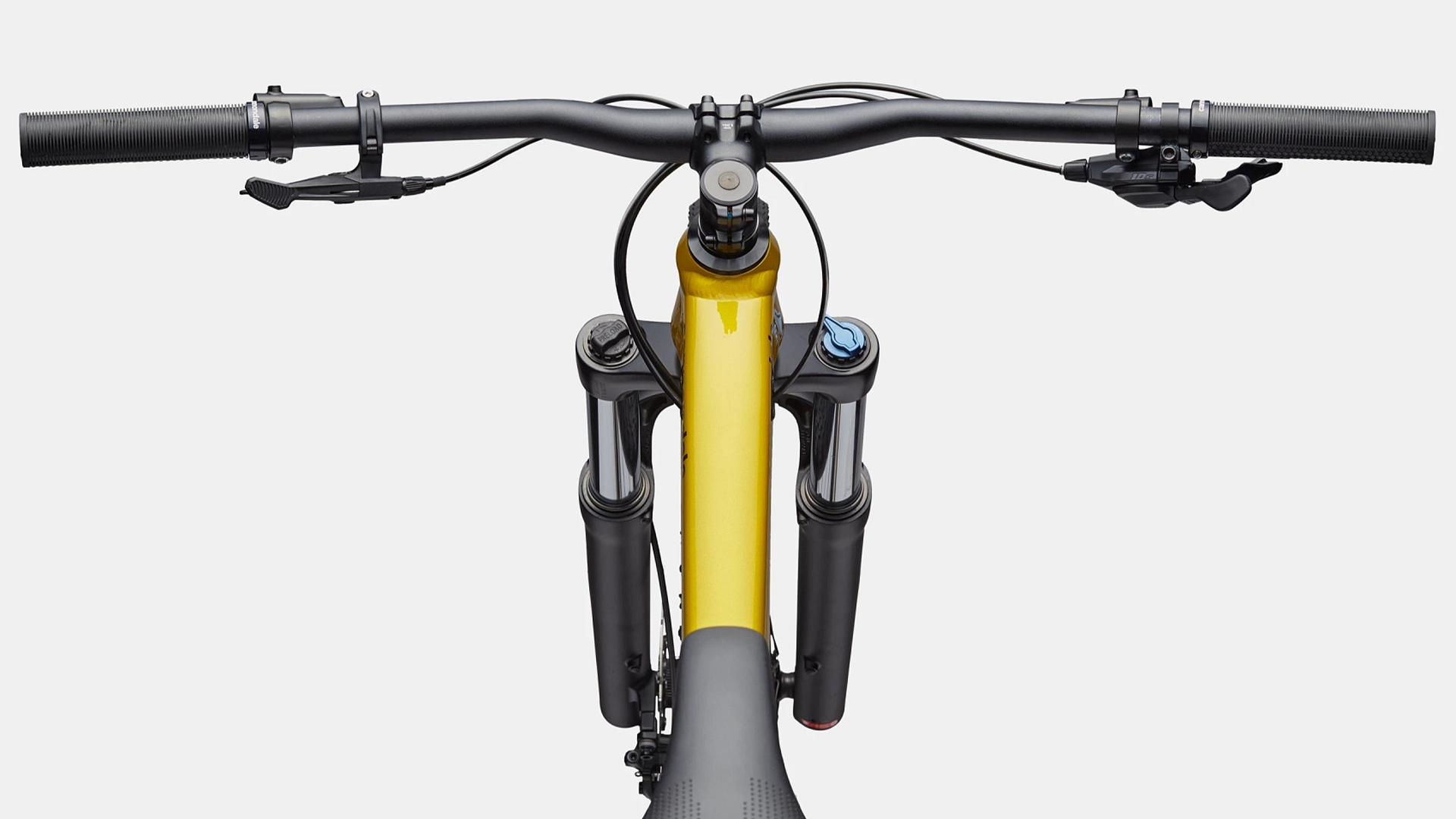 Guiador Cannondale 3 Riser, alumínio 6061, elevação 15mm, 8° para trás, 4° para cima, 780mm. Avanço Cannondale 3, alumínio 6061, 31.8, 0°. Punhos Cannondale Locking Grips. Selim Cannondale Ergo XC. Espigão telescópico TranzX, encaminhamento interno, 31.6, 100mm (S), 120mm (M), 130mm (L-XL).