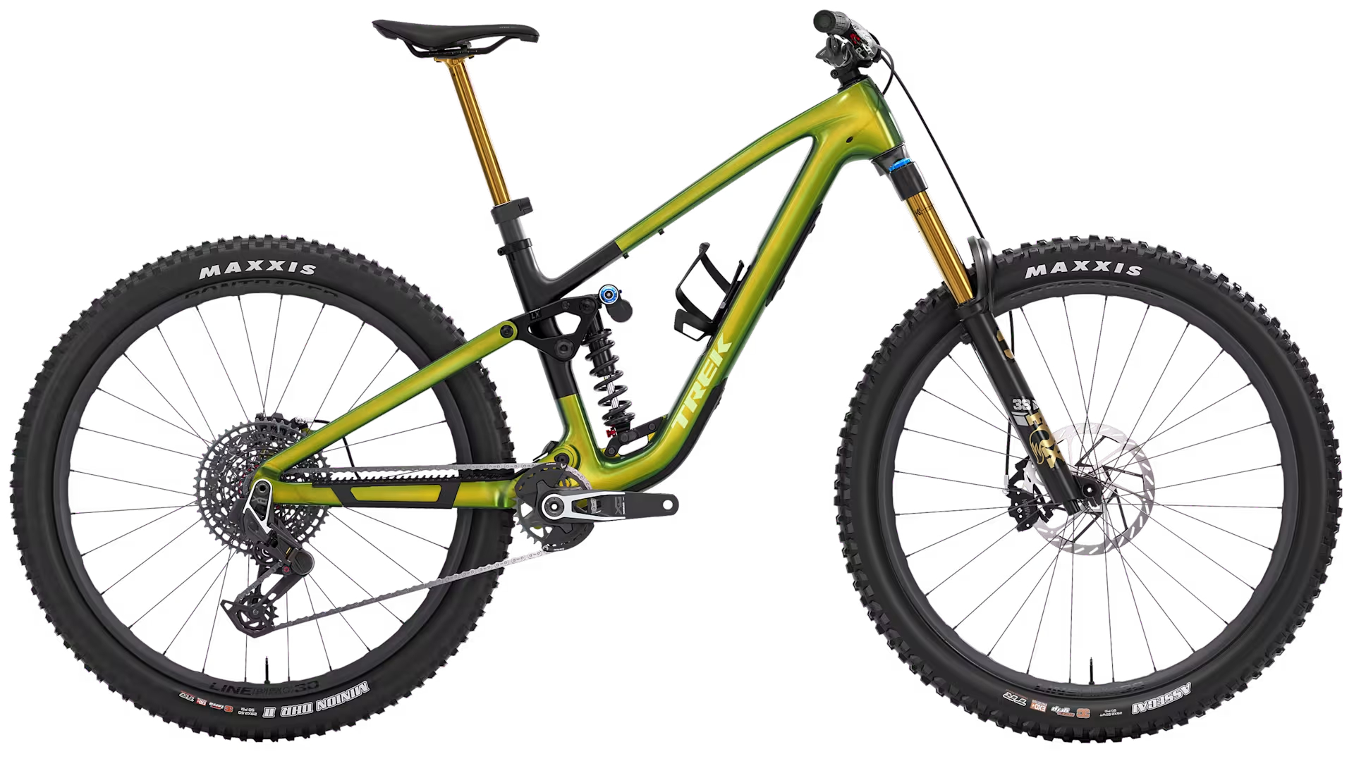 Carbono OCLV Mountain Bontrager Line Pro 30, Tubeless Ready, 6 parafusos (F) Boost110 Eixo passante Bontrager Switch, manete removível de 15 mm, 29” / (T) Rapid Drive 108, Boost148, eixo passante de 12 mm, 29". Pneus (F) Maxxis Assegai, tubeless ready, 3C, revestimento EXO+, MAXXGRIP, talão flexível, 29x2.5'' / (T) Maxxis Minion DHR II, tubeless ready, 3C, revestimento EXO+, MAXXTERRA, talão flexível, 29x2.5''.